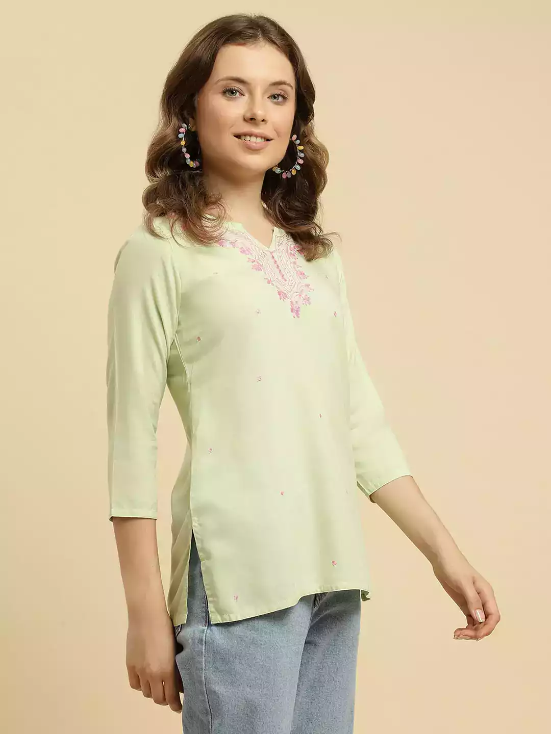 Pista Green Pashmina Work Short Kurti